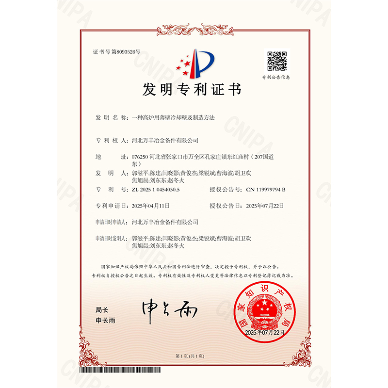 首页 >> 资质证书-图册 >>专利图片 >> 一种高炉用薄壁冷却壁及制造方法